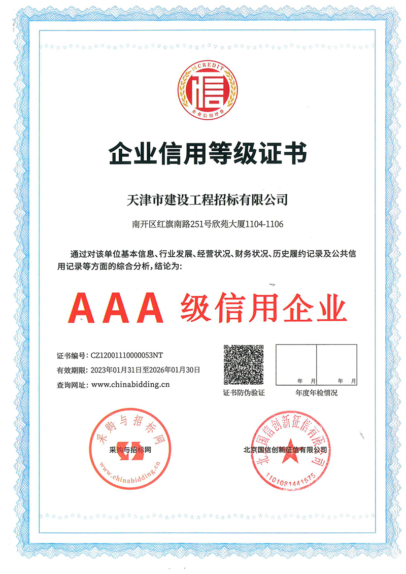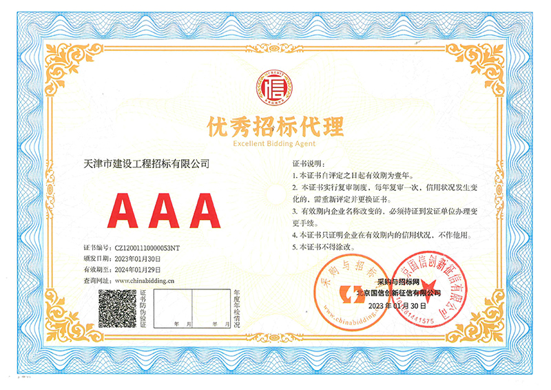 近日,從天咨公司下屬招標公司傳來喜訊,招標公司在采購與招標網以及北京國信創新征信有限公司聯合組織的企業信用等級等有關評選中,獲評3A級信用企業和3A級優秀招標代理企業。