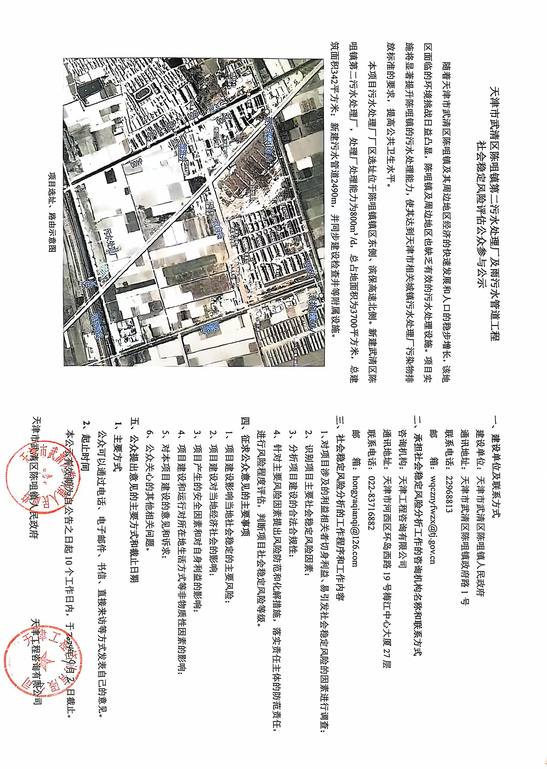 關于天津市武清區陳咀鎮第二污水處理廠及雨污水管道工程社會穩定風險評估公眾參與的公示