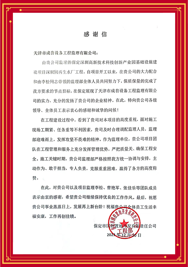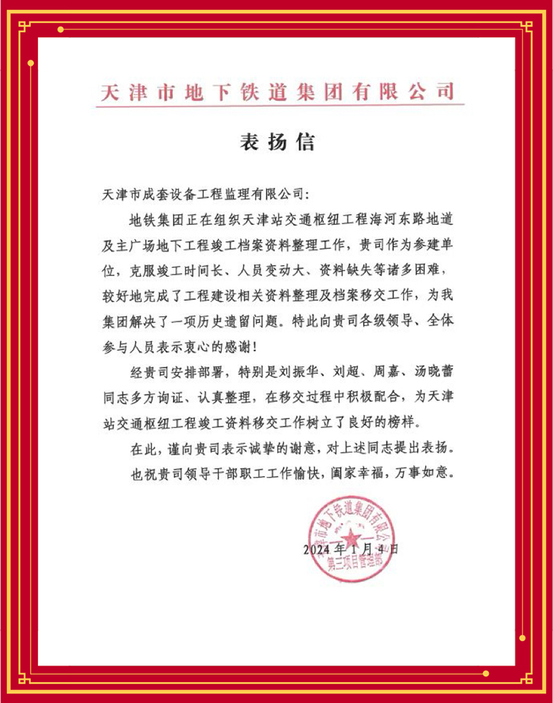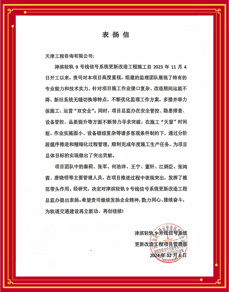 津濱輕軌9號線信號系統更新改造工程項目部感謝監理團隊多舉措解決項目施工作業接口復雜、改造期間運能不降、新舊系統無縫切換等難題,力保施工、運營“雙安全”;天津長遠嘉和置業有限公司贊賞含璋寶坻項目怡錦園項目監理團隊以高度的責任心、高效的組織協調管理和扎實的專業技能推動項目圓滿完成;天津華勘穂金房地產開發有限公司感謝監理項目部主動對接業主需求,有效管控質量安全,切實保障施工進度,很好地履行監理職責......